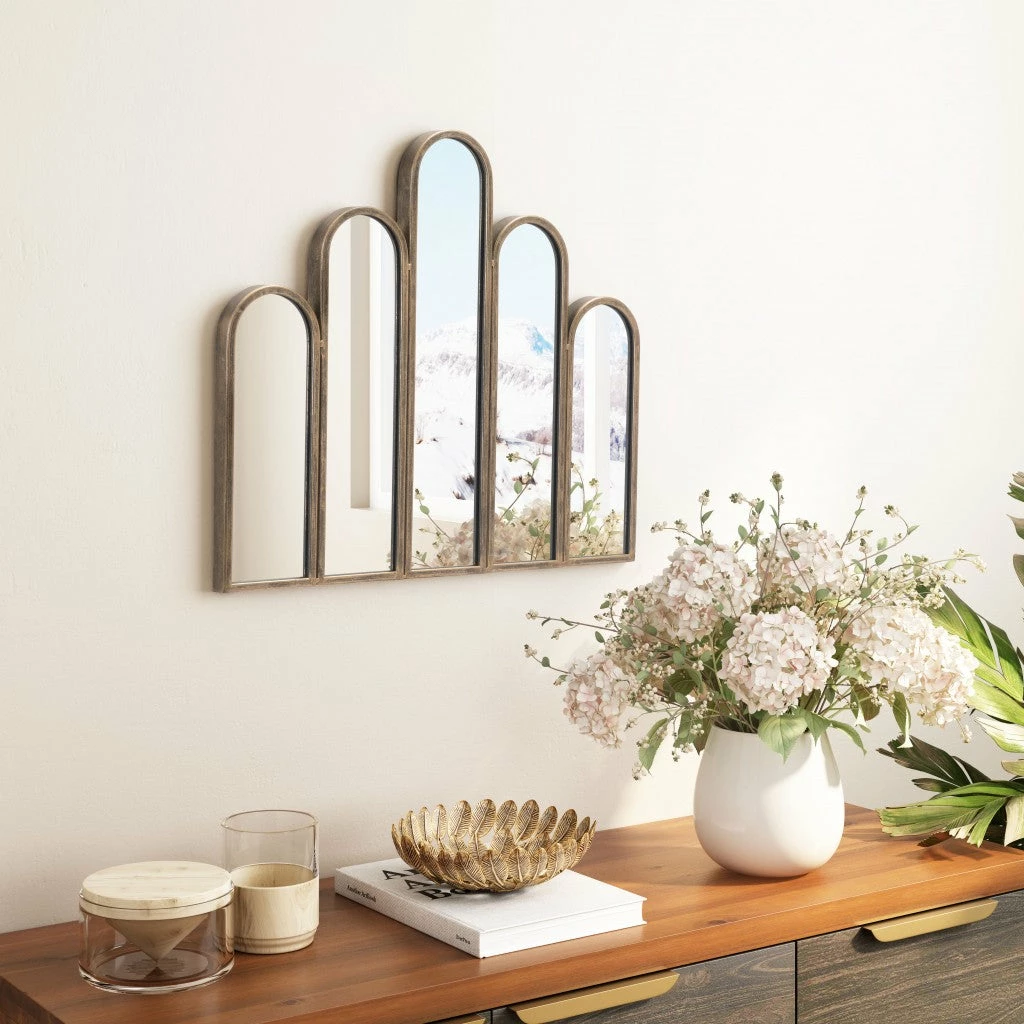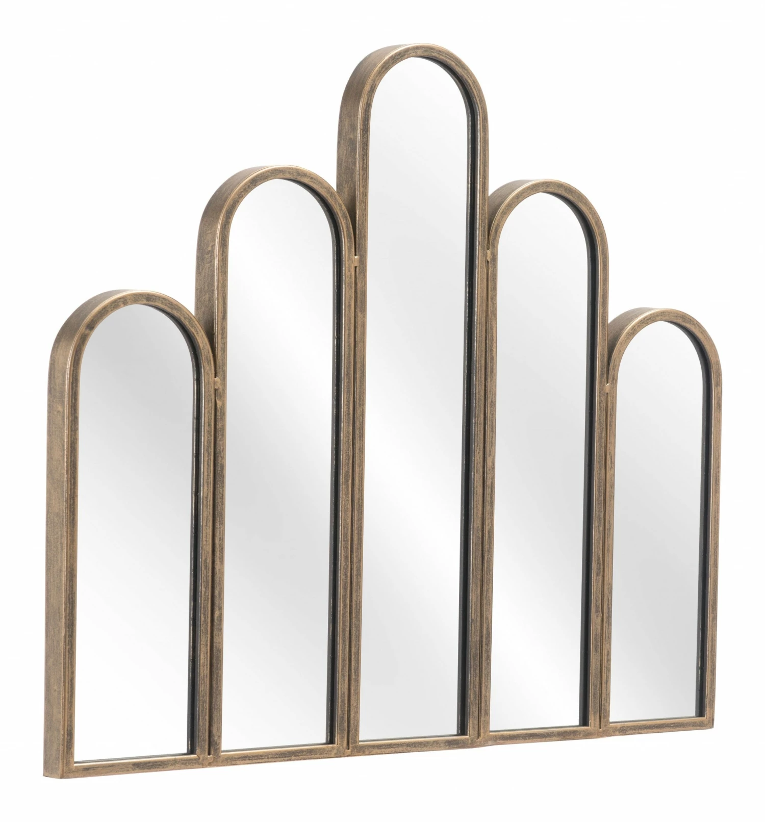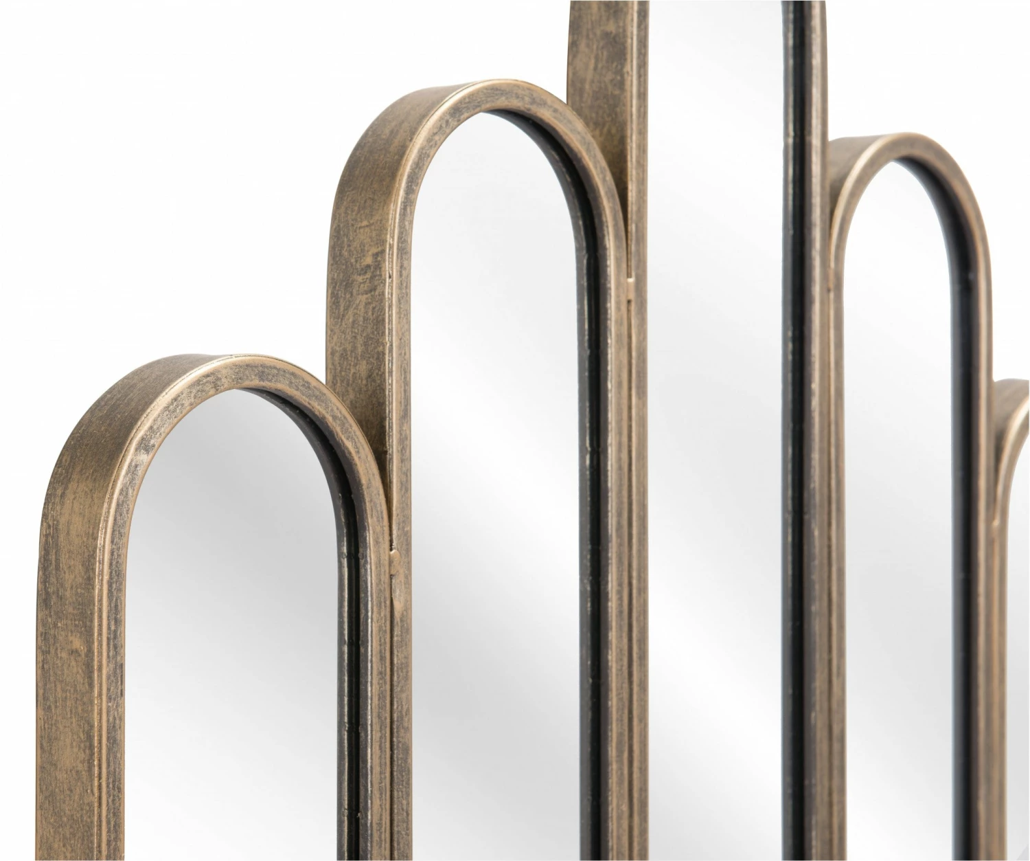 This antiqued gold deco shape mirror is the perfect mix of traditional and modern design. The art deco style frame is made from stainless steel and has been finished to a gold finish. There are five separate pieces that are joined together to create one cohesive piece. The mirrors in the middle of each piece vary by length which adds depth to the whole piece. While this mirror has unique design elements, it will work in almost any room of your home. You can use it yourself or gift it to your friends and family as a house-warming gift. A hardware kit is included to help you in the installation of the mirror. 21.9″ H x 24″ W x 1.3″ D