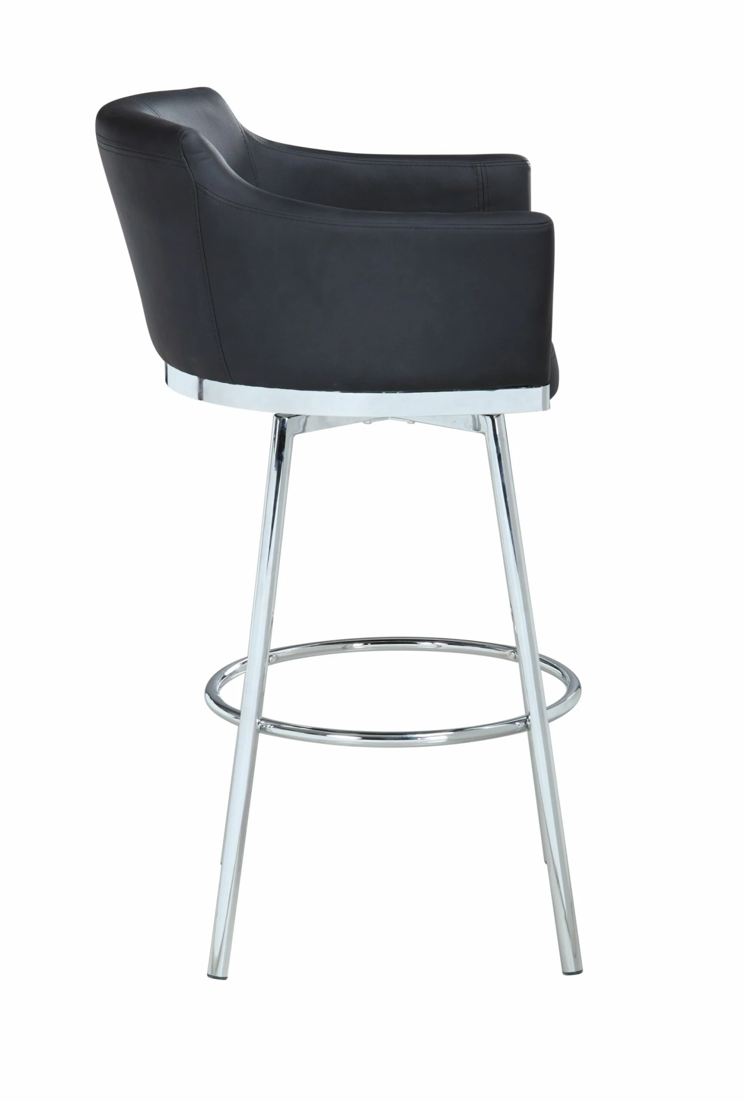 This modern club-style bucket stool features a memory swivel, a PU (faux leather) seat and a chrome frame with a built-in footrest.