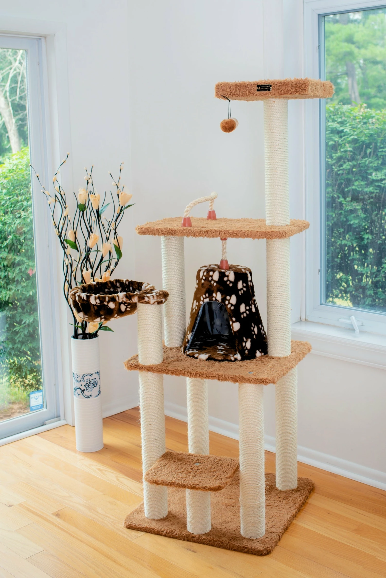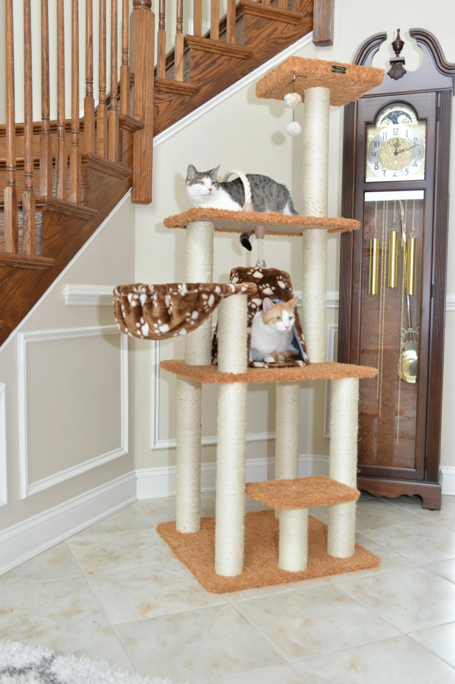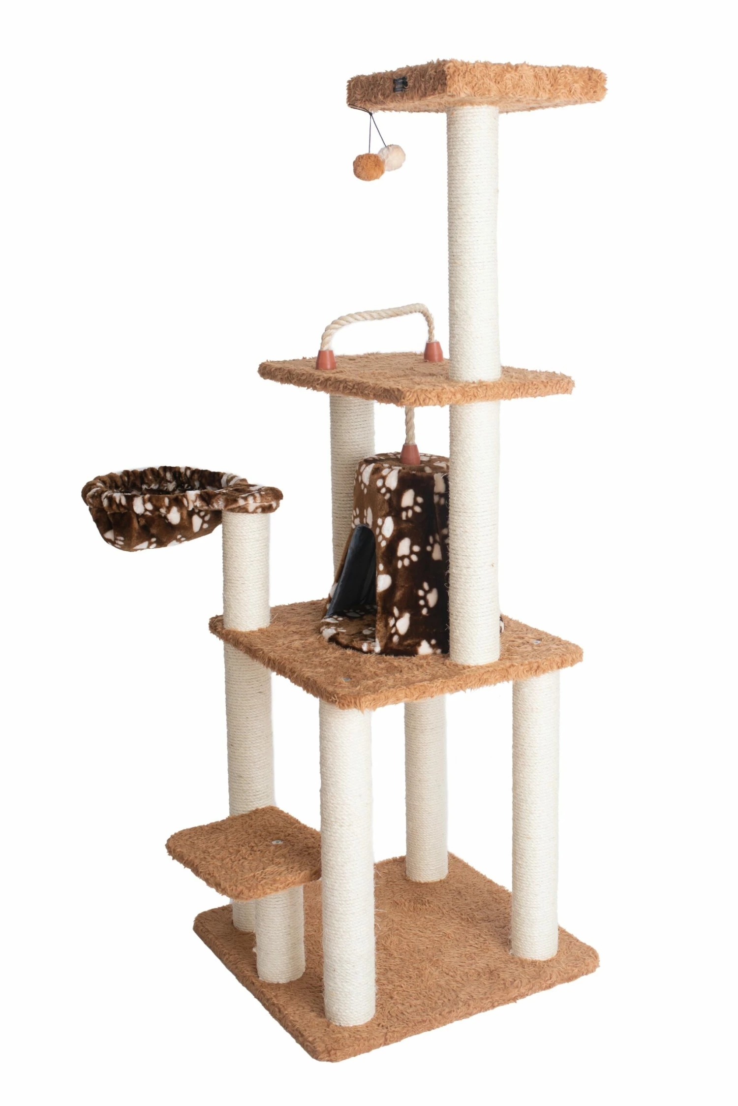 Armarkat model No. A6403 is Cat Daddy approved by noted cat behaviorist Jackson Galaxy and features a playhouse, basket, hanging toy and multiple perches and sisal scratching posts. F And B Bullet: Chocolate and Beige Combo with high density and Ultra-Thick faux fur covering for feline’s comfort, coverings are permanently adhered to wood structures Well constructed of 15mm pressed wood material, making it not only thicker but stronger. 100% natural, seasoned sisal rope wraps all posts securely for years of “scratch ability.” Dimensions: Post Diameter: 3.5″; Base: 24″ x 24″; Playhouse: 14″(W) x 12″(H); Perch: 14″ Max Holding Weight: 50 lbs Six-month warranty included. Replacement parts available from manufacturer.