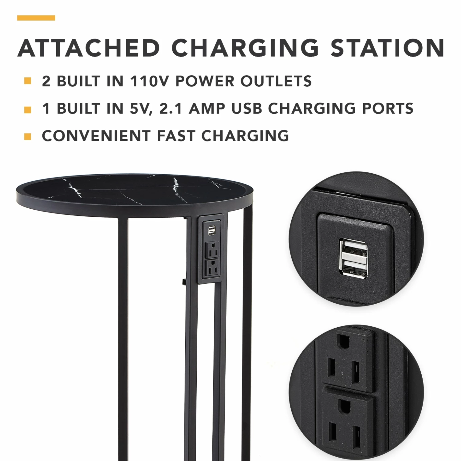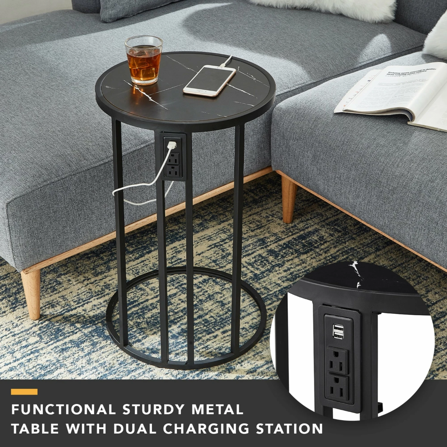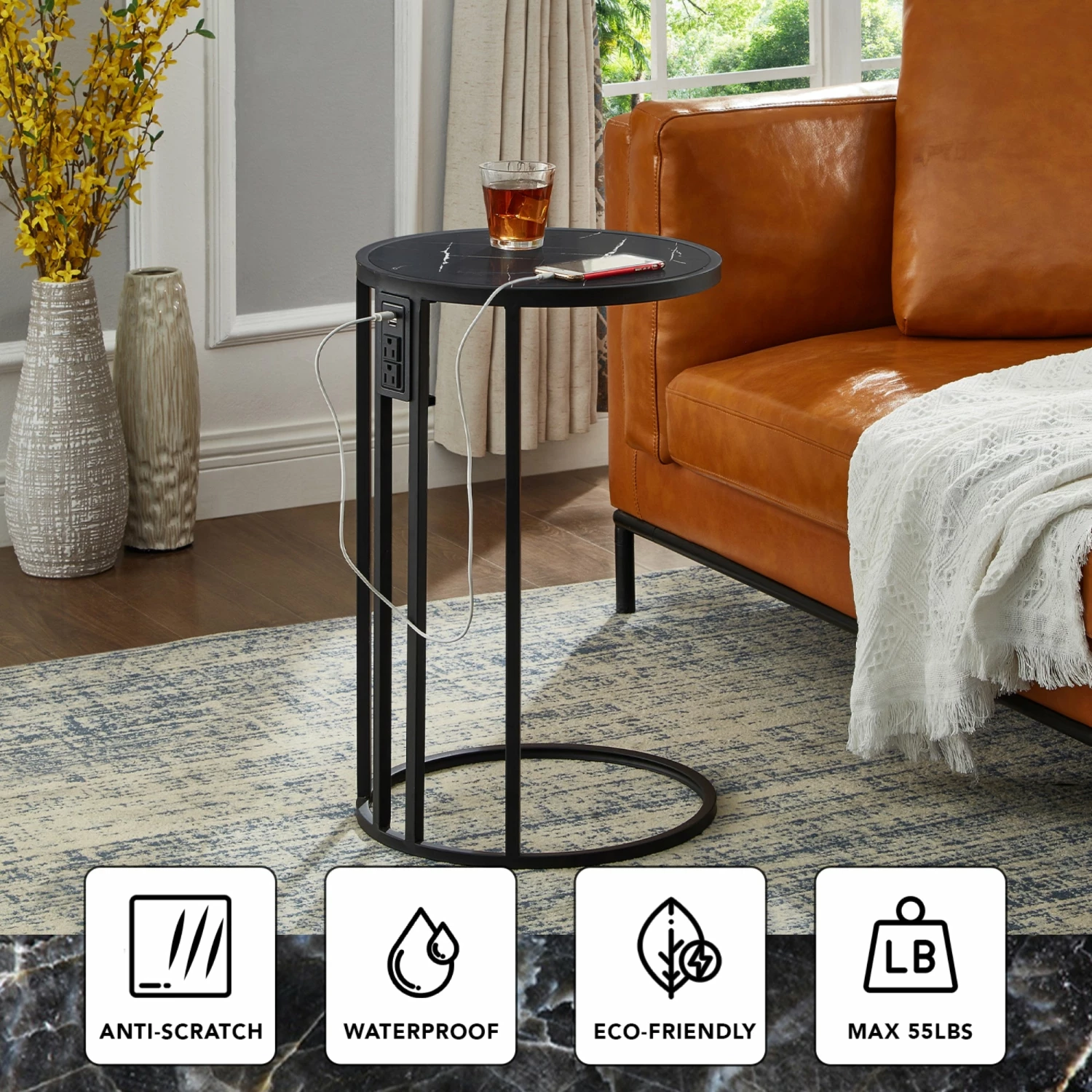 The C-shape of this functional table with a charging station offers a unique blend of a tabletop with the ability to power your technology. It allows you to slide the foot of the table under a chair or sofa while being a perfectly portioned top is excellent for keeping snacks drinks or books close at hand. A unique charging station with 2 outlets and 2 USB ports on the side helps you to scroll through your social feeds without fear of battery drain. A sturdy βCβ structure made of thick square iron tubes and an MDF veneer top completes the appeal of this stylish snack table and your favorite lounging station.