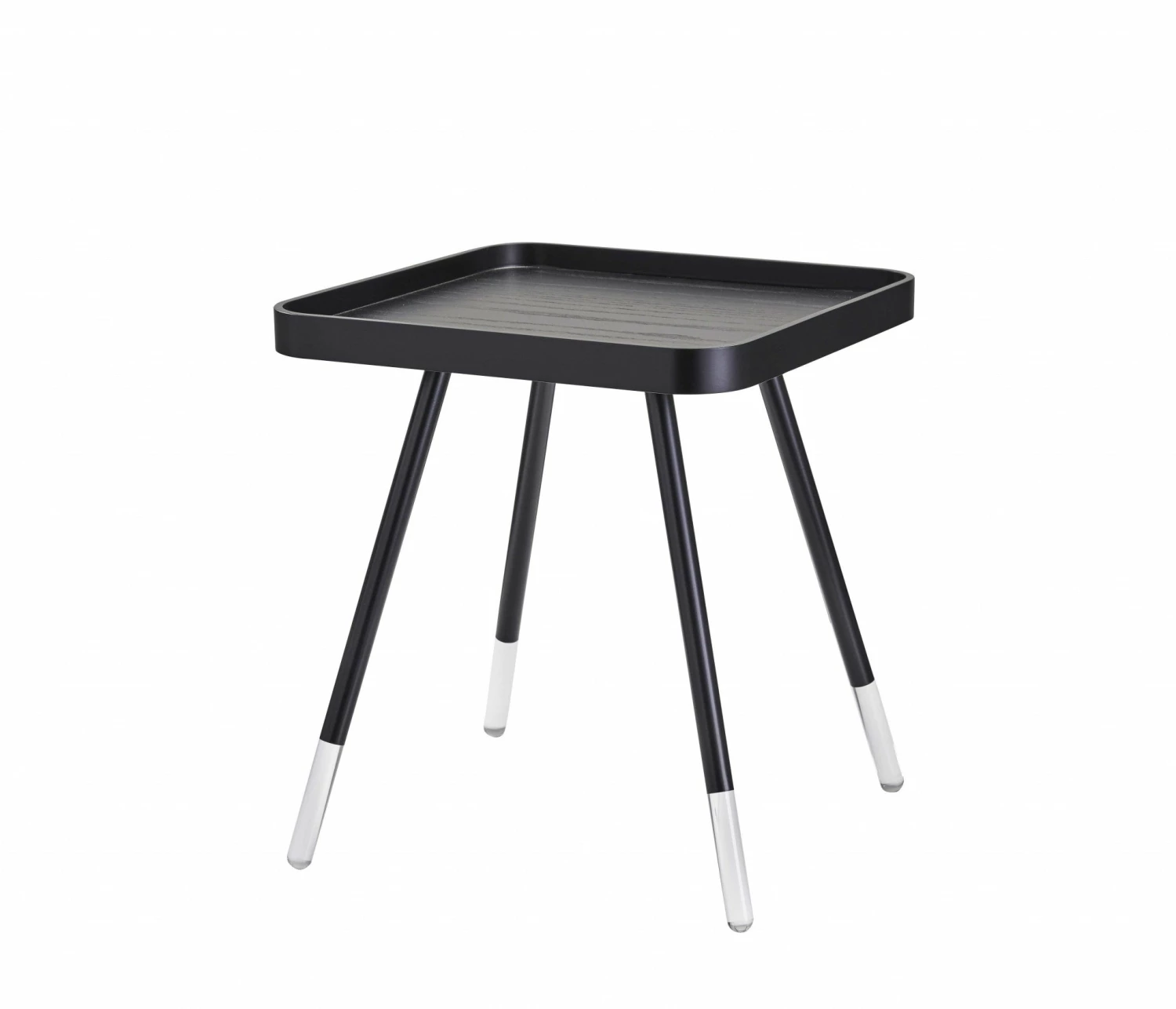 Black wood grain against a smooth black frame gives this End Table a sharp, contemporary look. Clear acrylic tips on the legs add modern elegance while alluding to a floating appearance. A catch-all rim around the table top offers a secure setting for your valuables. Set this end table next to the couch for stylish storage or next to the bed for a minimalist nightstand. 19″ X 19″ X 21.25″