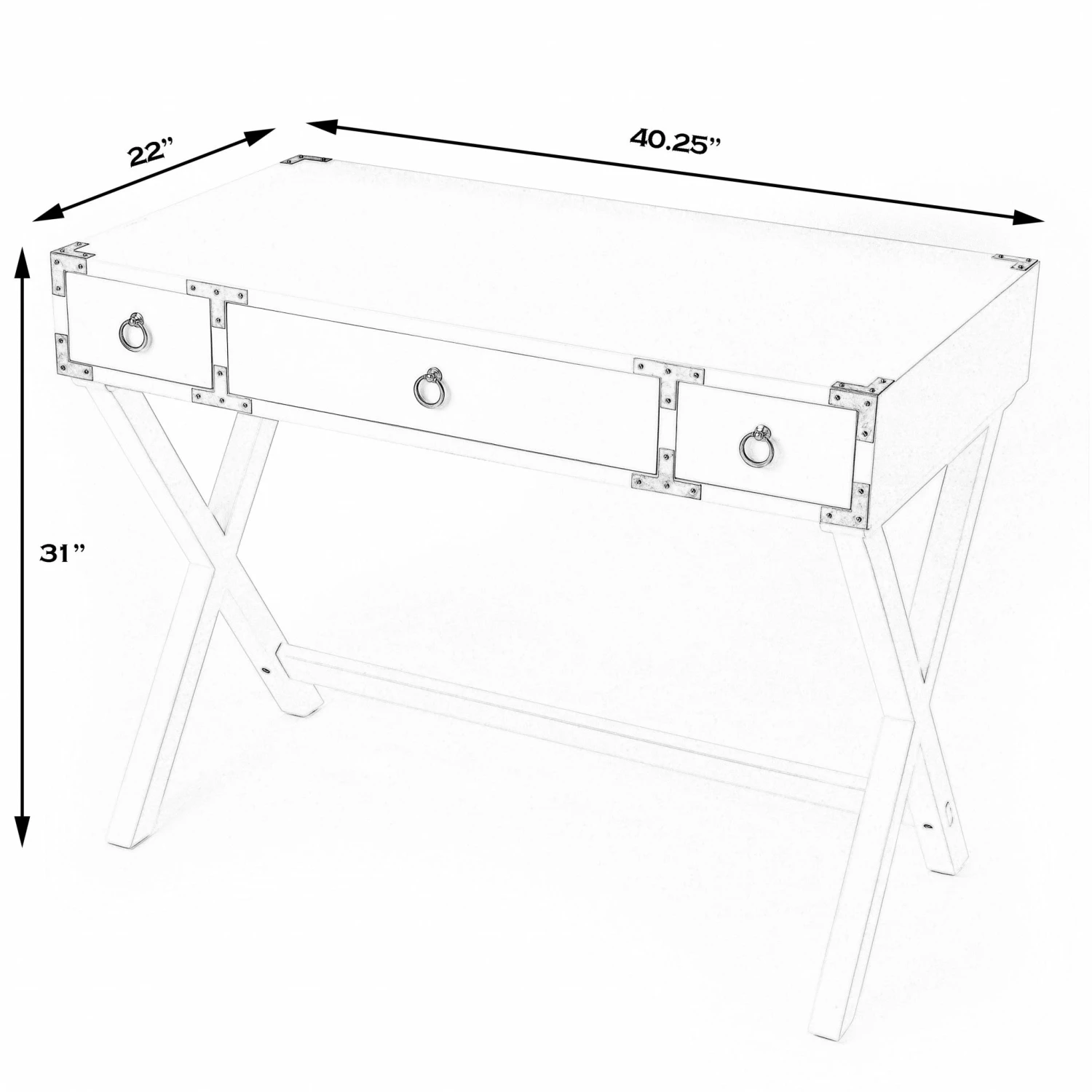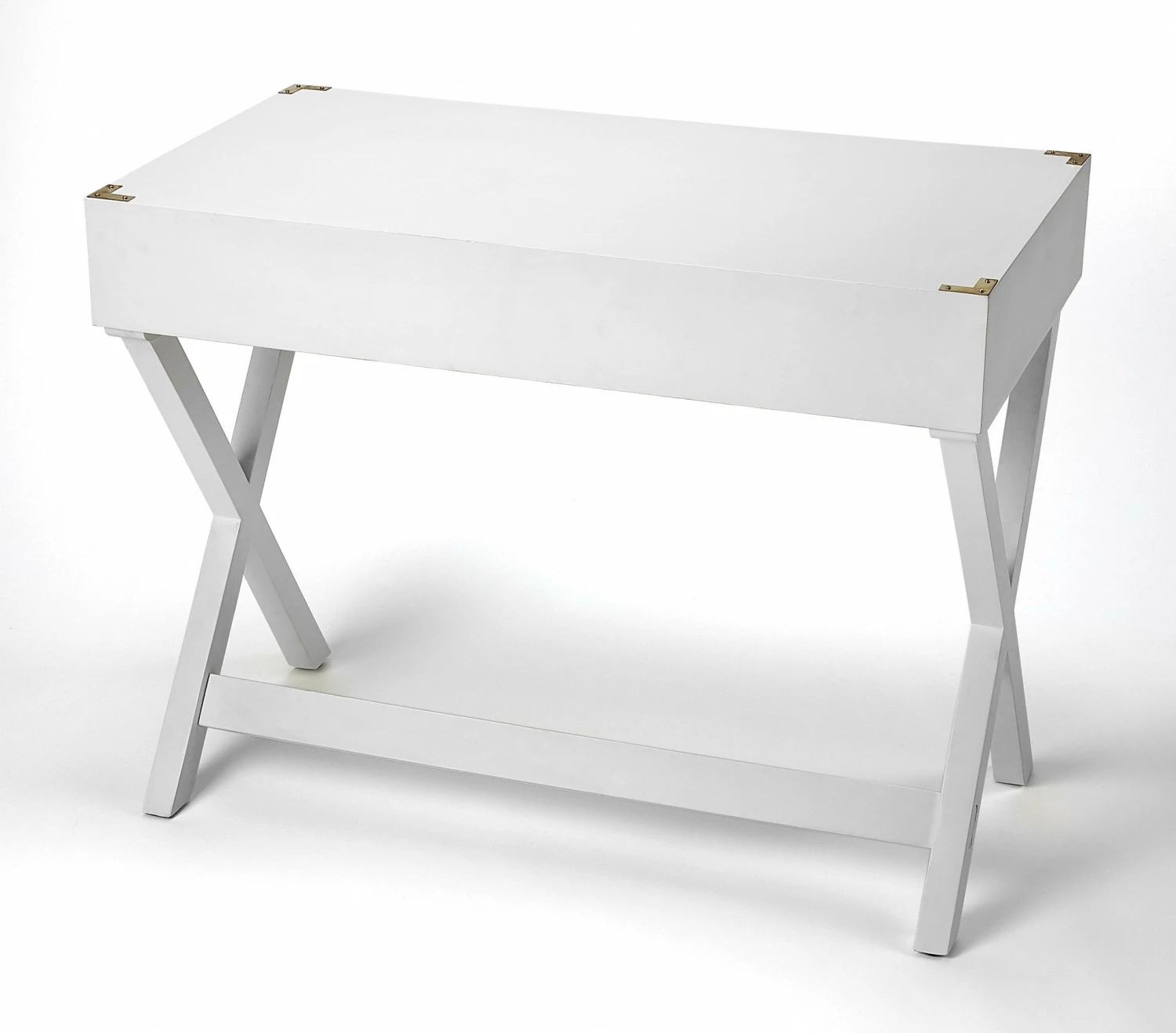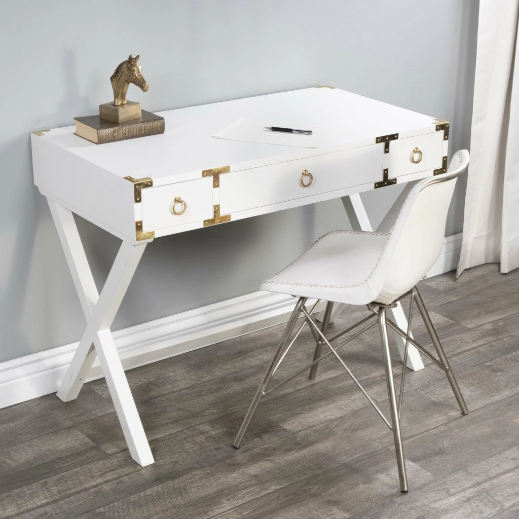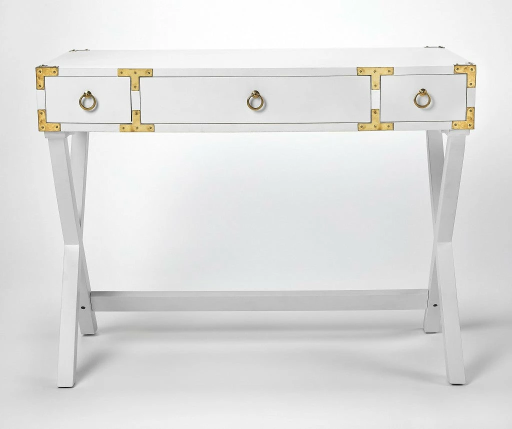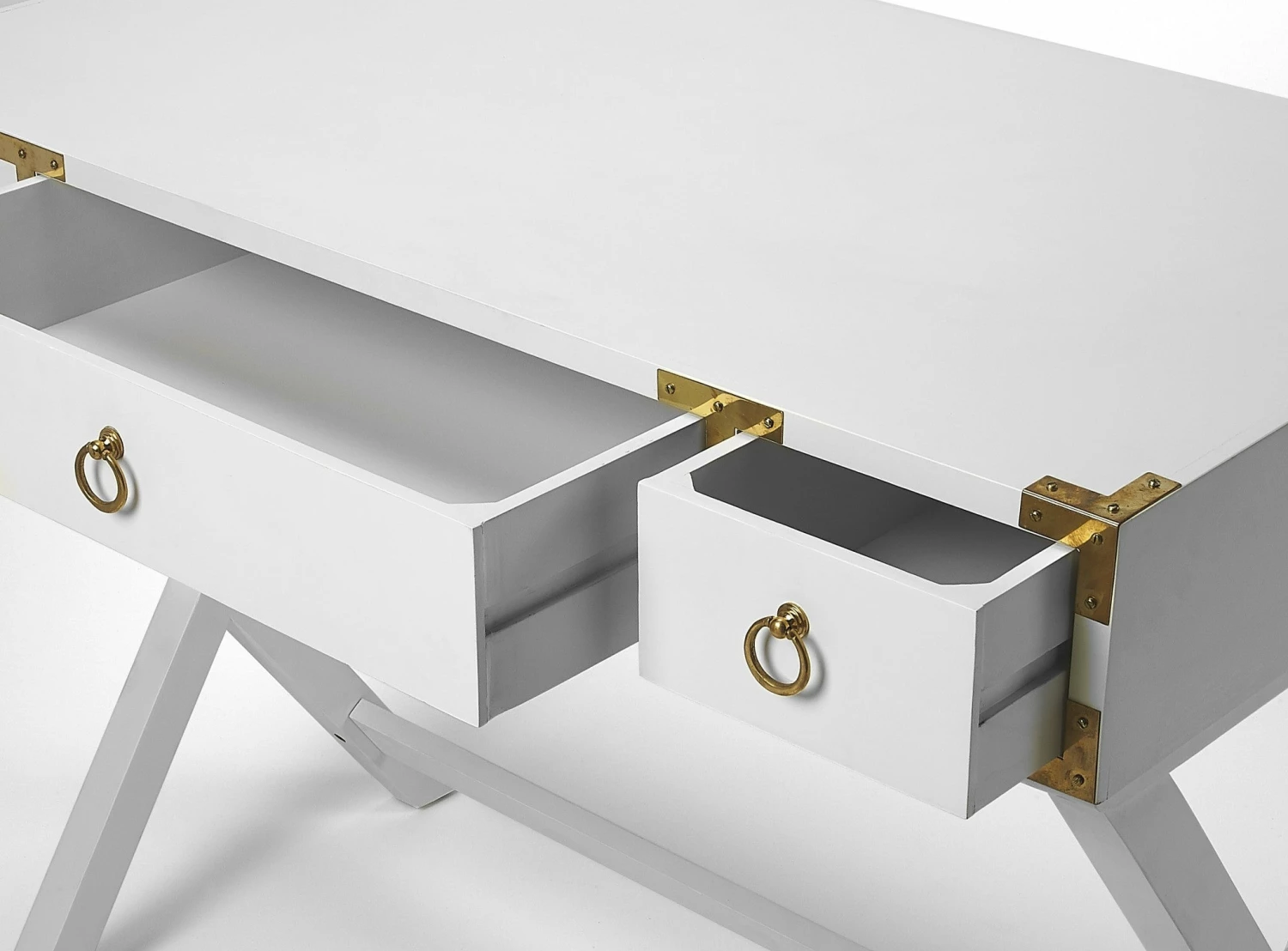 Inspire your creativity and enhance your productivity with the Glossy White Writing Desk. Versatile in style the writing desk can also be substituted for your work from home needs. Manufactured from mango wood solids in a glossy white finish it is strong and durable in function. The cross legged frame is additionally supported by a wooden beam in between for better stability. The gold hinged screwed edges along with the gold pull rings accentuate it’s presence. Owing to it’s framework the desk can be easily positioned against any flat surface. 31″ x 40.25″ x 22″