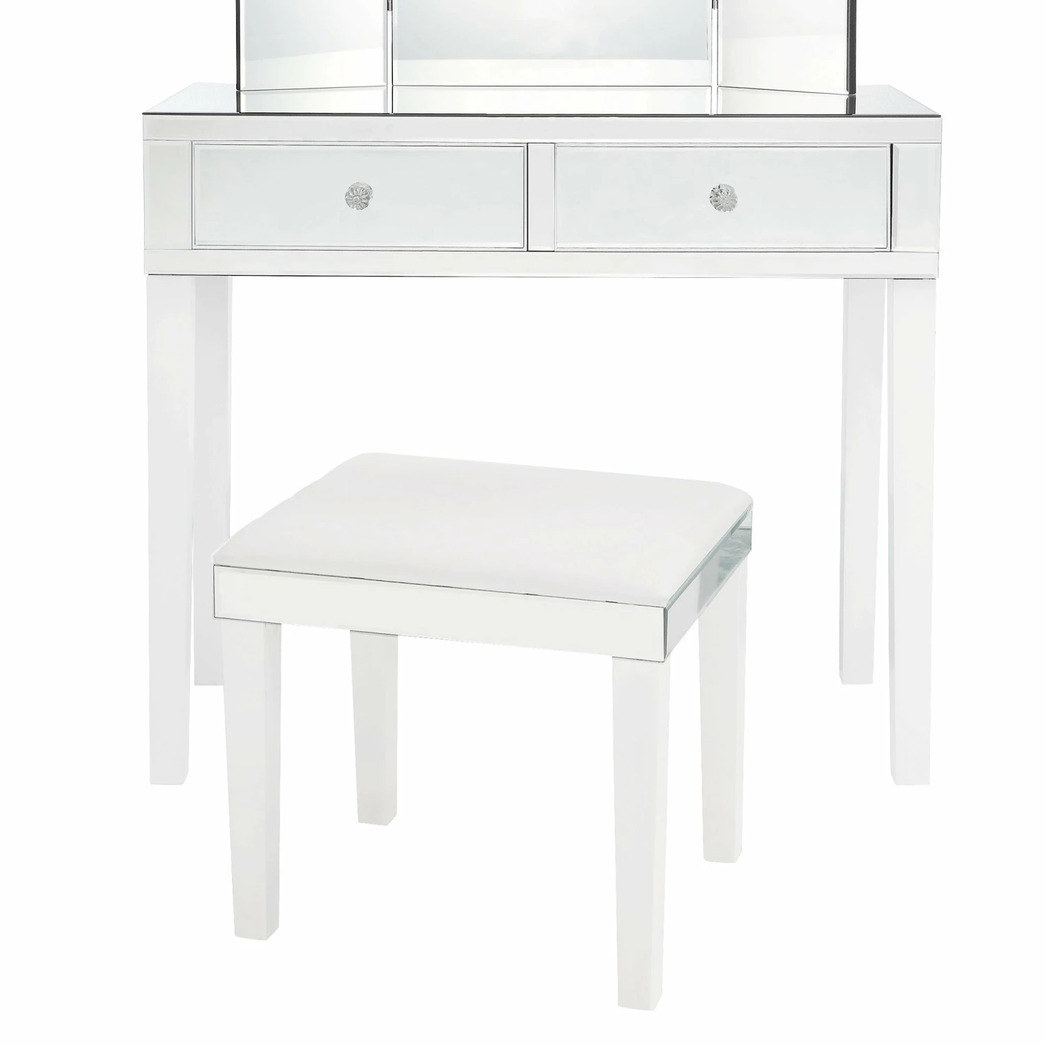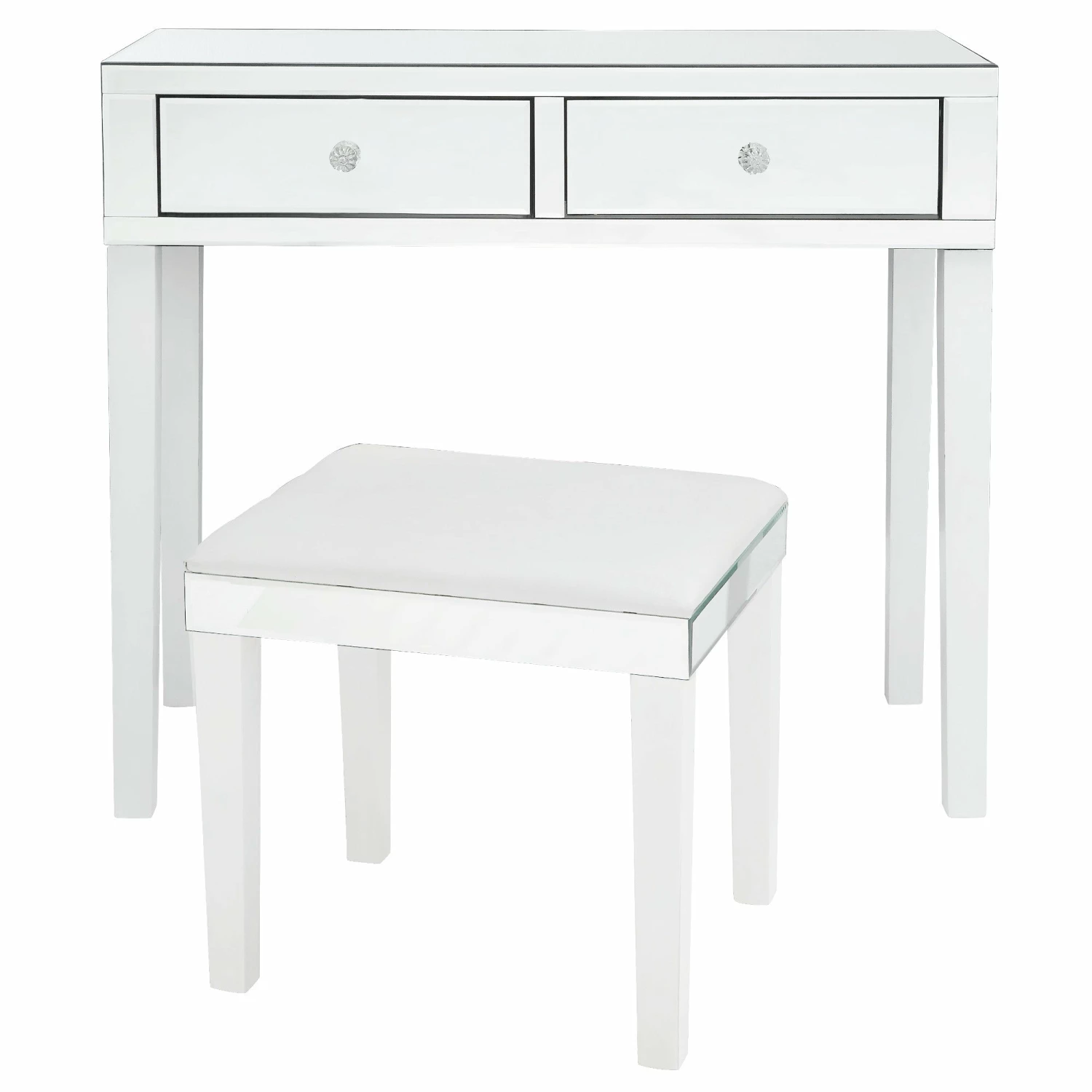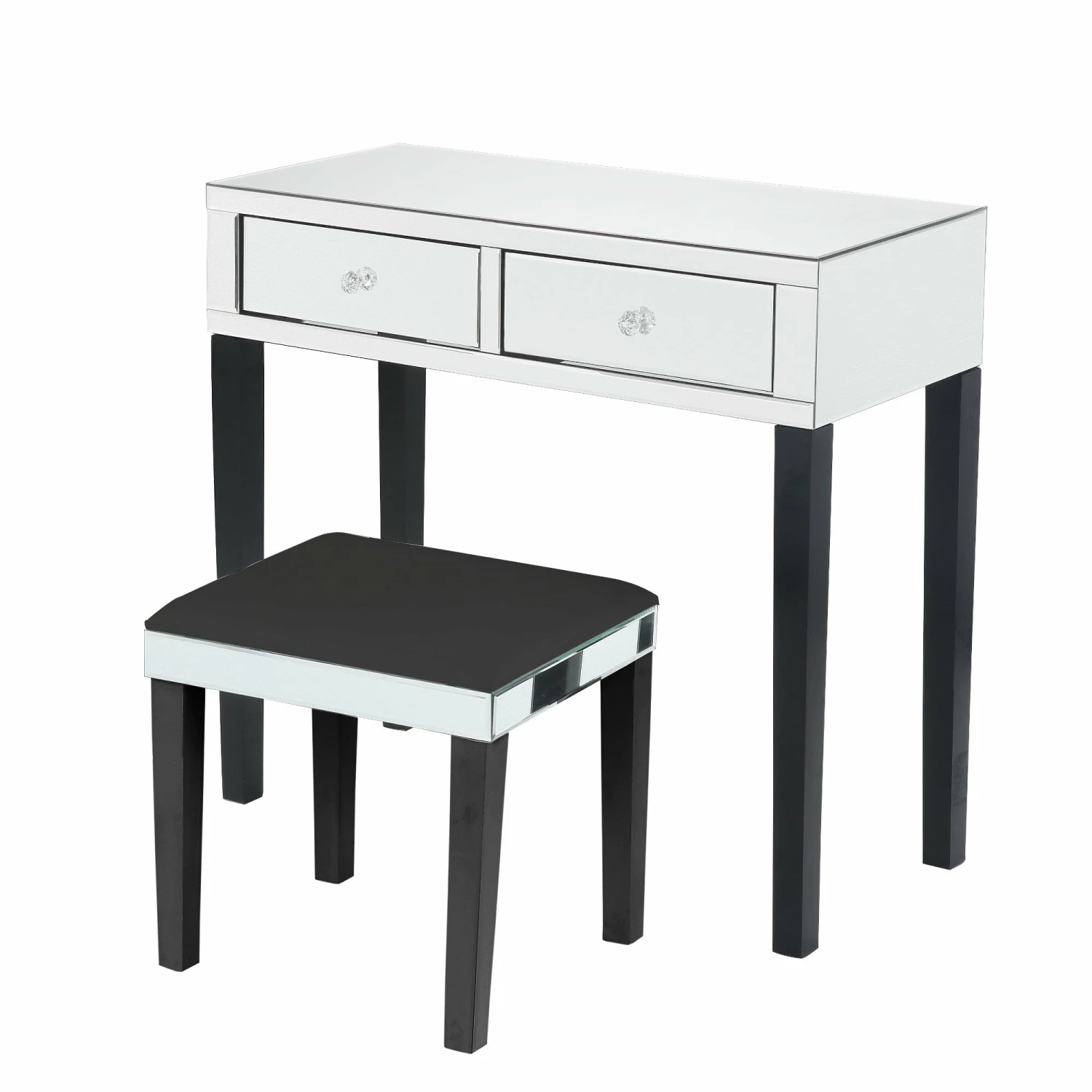 Our chic mirrored vanity set brings classic glamour to your room. This elegant furniture set is great for storing jewelry, cosmetics, and makeup brushes. The stylish, contemporary design features two storage drawers and the smooth mirrored tabletop provides space for cosmetics and beauty supplies. This vanity table is complete with matching stool built with a padded upholstered seat. Pair it with equally antiqued decor or make it modern with contemporary accents.
