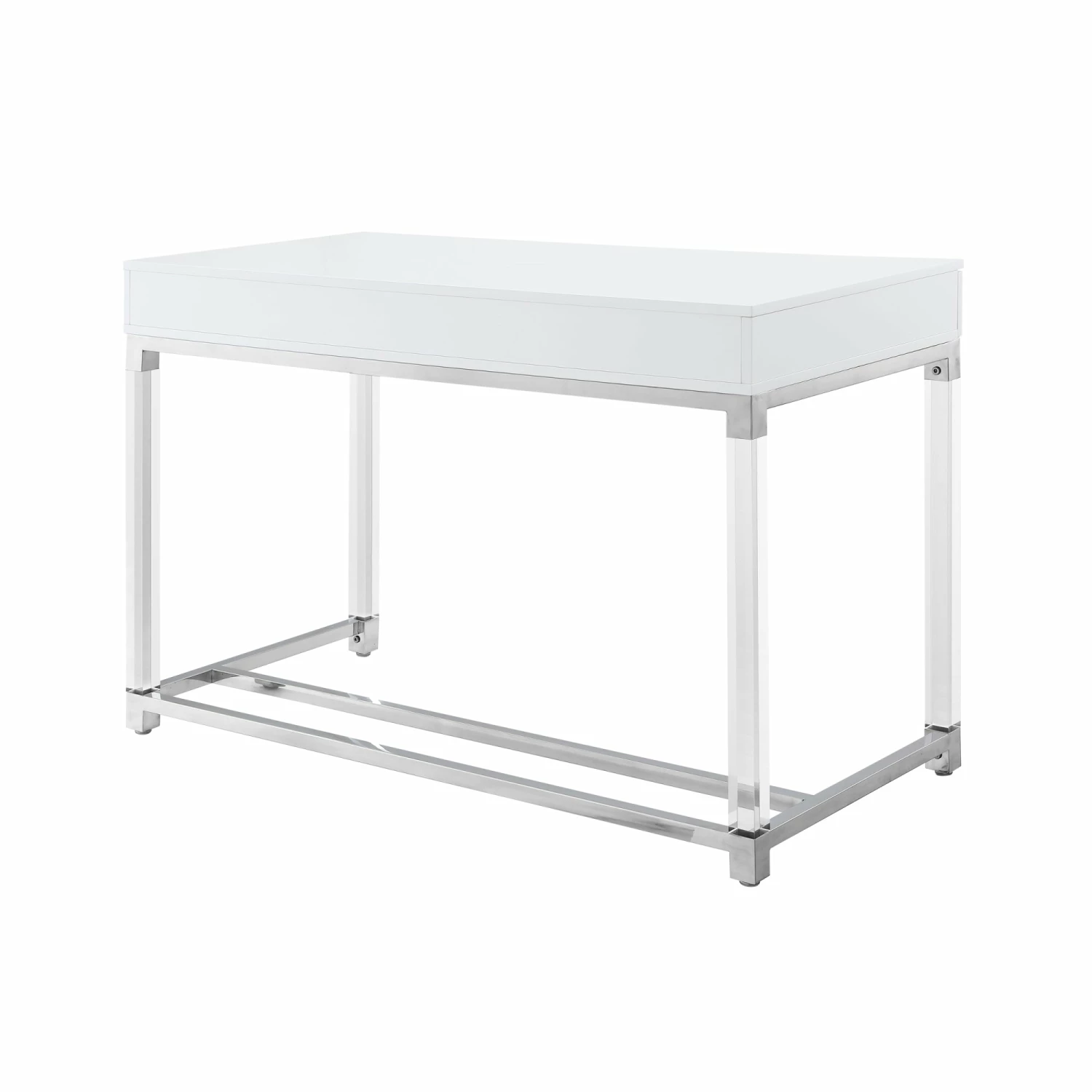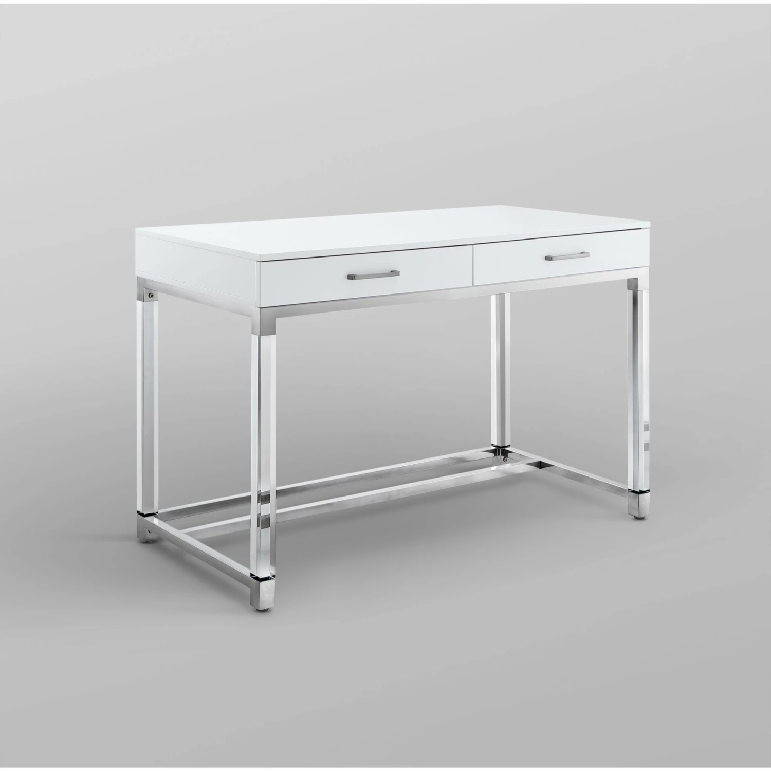 The unusual design of this writing desk/vanity/makeup table/computer desk/console table make it a striking addition to any space, creating shimmering and lustrous appeal. Crafted from durable eco-friendly MDF with in a sleek high gloss finish, acrylic legs, stainless steel polished base frame with matching handles, this elegant 2 drawer piece is an excellent solution for the modern home. Smooth gliding drawers are perfect for organizing living essentials.
