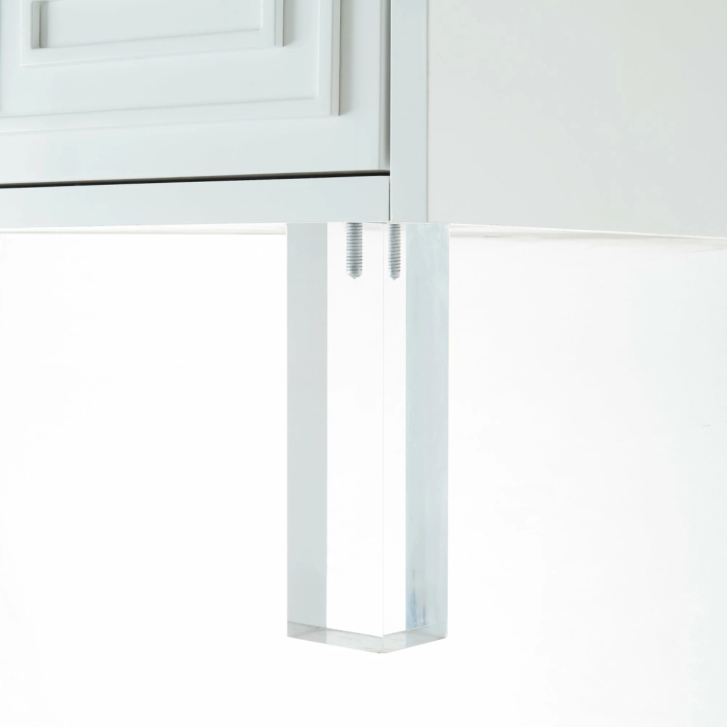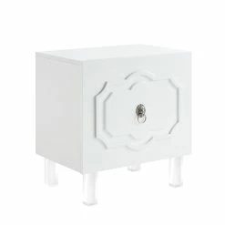 Our side table infuses an exquisite accent to your main furniture to create that modern cozy atmosphere in your home. Crafted from durable eco-friendly MDF in a sleek lacquer finish with lucite legs, this elegant piece is ideal as an end table in your living room or a night stand in your bedroom. The rectangular top surface is perfect to display a lovely floral arrangement, lamp, or family photos; while the spacious two shelf cabinet with decorative door and silver ring pull is perfect for stashing and organizing books, magazines, accessories and other living essentials safely out of sight. This item requires assembly upon delivery.