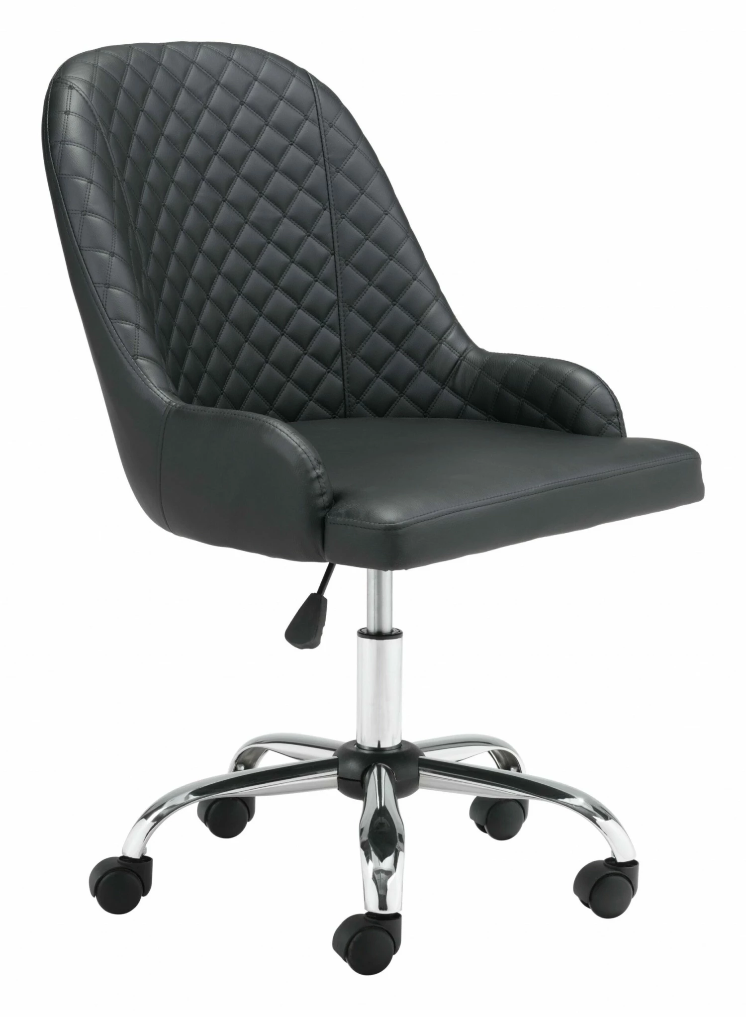 This Black Quilted Back Faux Leather Swivel Office Chair is comfortable to use, and it looks great in any space. With its hard wearing and stylish quilted stitching vinyl covering, this office chair also has a sturdy steel frame and base that give it a modern look. It has a classic design that fits in any home office or bedroom. The office chair has a tilt mechanism, 360-degree swivel wheels, and height adjustment. 35.8″ H x 23.2″ W x 28″ D. β’ Height Adjustability β’ 360-degree swivel wheels β’ Lumbar Support β’ Measures 35.8β H x 23.2β W x 28β D β’ Black Color with Chrome Plated Frame and Base