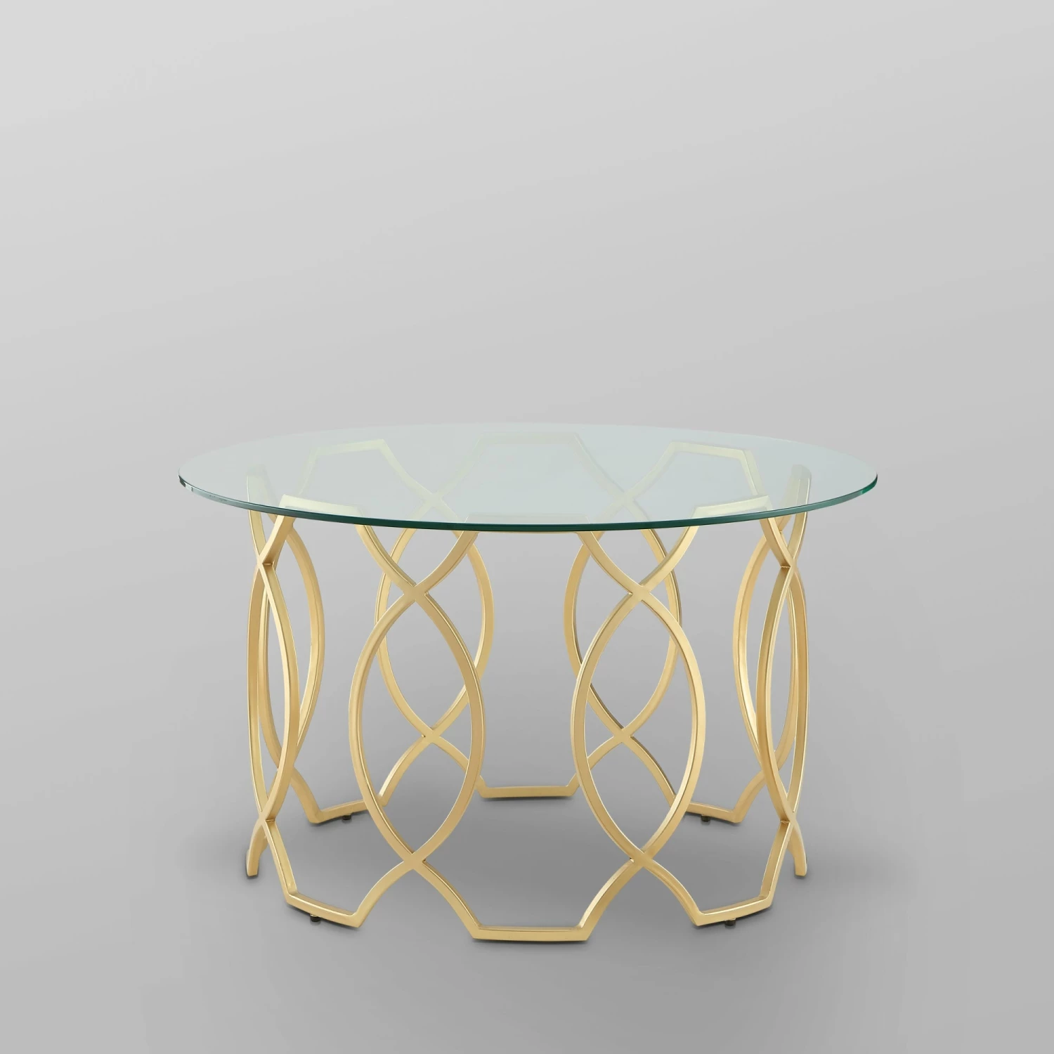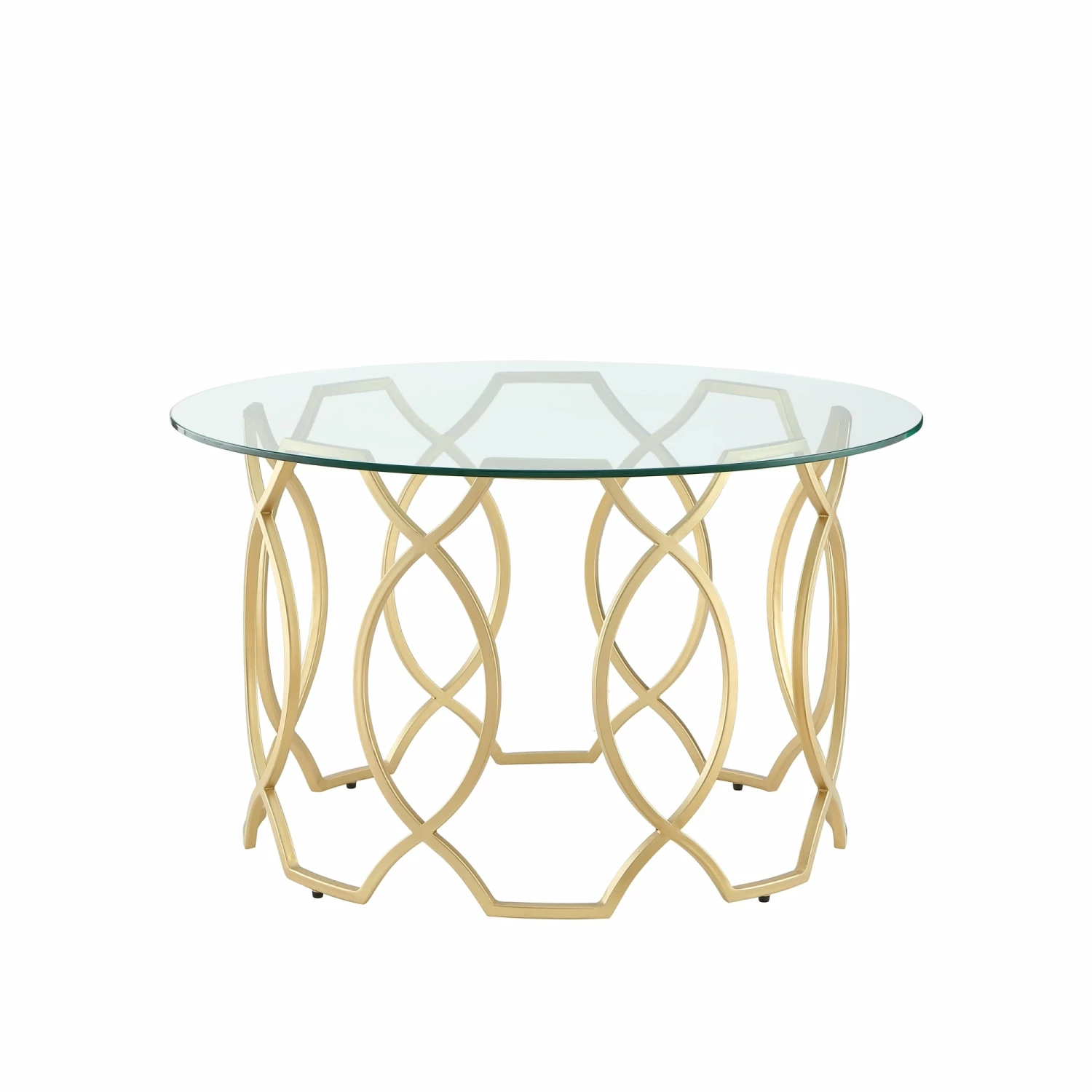 This modern glass coffee table is designed with an elegant geometric metal frame and an open round top that creates a welcoming feeling and provides ample space to put drinks or decor on top. Whether using it as the perfect perch for your remote control or morning mug it brings a sophisticated and luxurious look to any setting. Perfect as an accent piece or centerpiece. Made with a safety tempered glass top and a durable metal frame