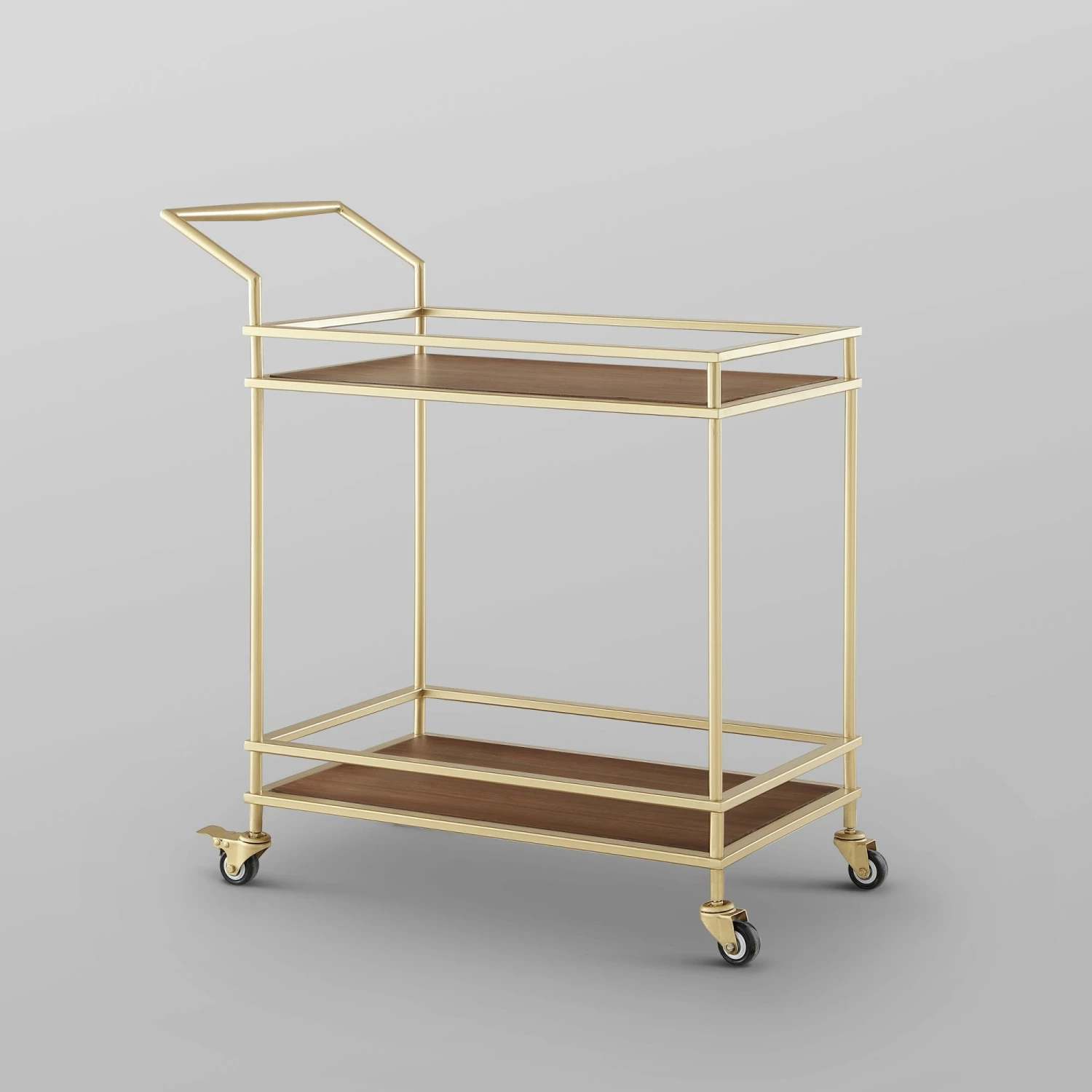 Your home deserves nothing but the best. Impress your guests with this versatile indoor bar cart. It is a perfect storage solution for a cocktail. The caster wheels make it easy to keep this cart where the party is happening. This utility cart is great for the kitchen, dining room, bedroom, bathroom and home office. It is perfect for holding dinnerware, beverages, books, bathroom accessories. The cartβs metallic finish and simple straight lines design add modern appeal, and the tempered glass/MDF shelves provide exceptional display and storage capacity. On the top shelf you can display your treats and drinks and bottom shelf is perfect for wine bottles and stemware storage.